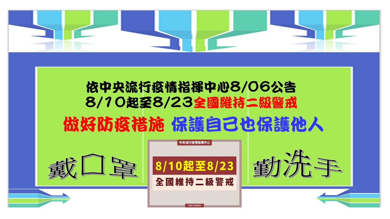 依據中央疫情指揮中心公告8/10-8/23維持二級警戒,