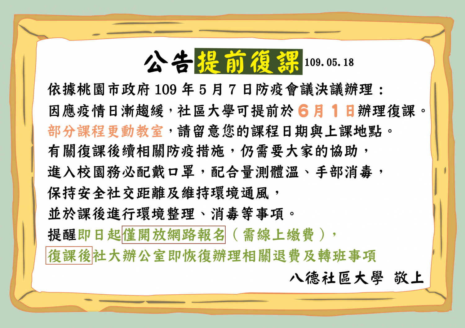 2020/5/18109-1春季班將於6月1日起復課