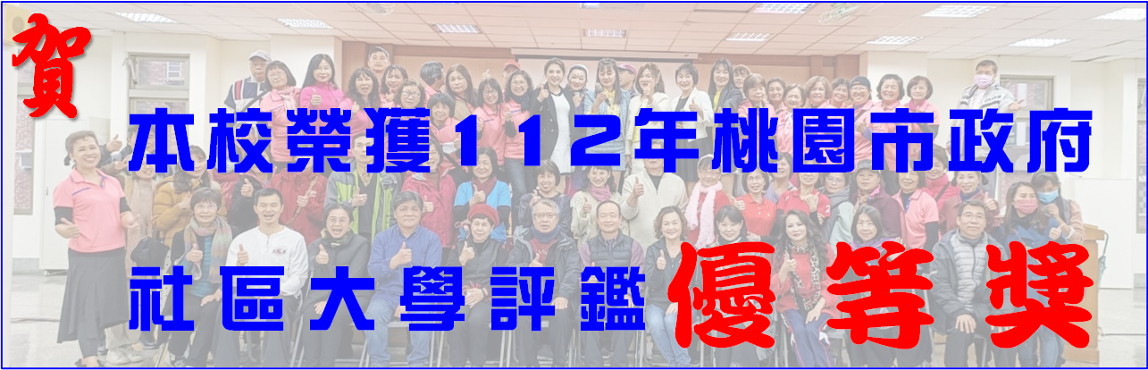 本校榮獲112年桃園市政府社區大學評鑑「優等獎」,感謝所有社大成員(講師、志工、班代、學員)的支持參與;今年也請大家多多關照,謝謝 !!