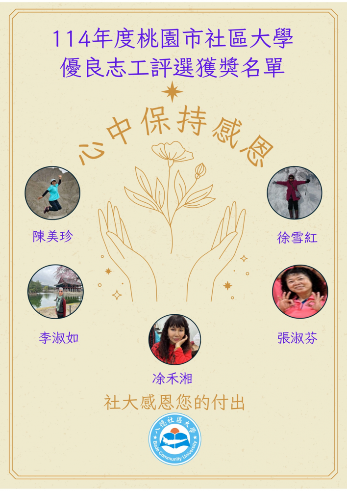 2025/9/3114年桃園市社區大學優良志工當選名單