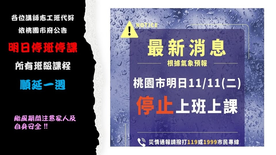 依桃園市府公告 11/11(二)停班停課,社大所有班級停課,課程順延。颱風期間請注意安全。