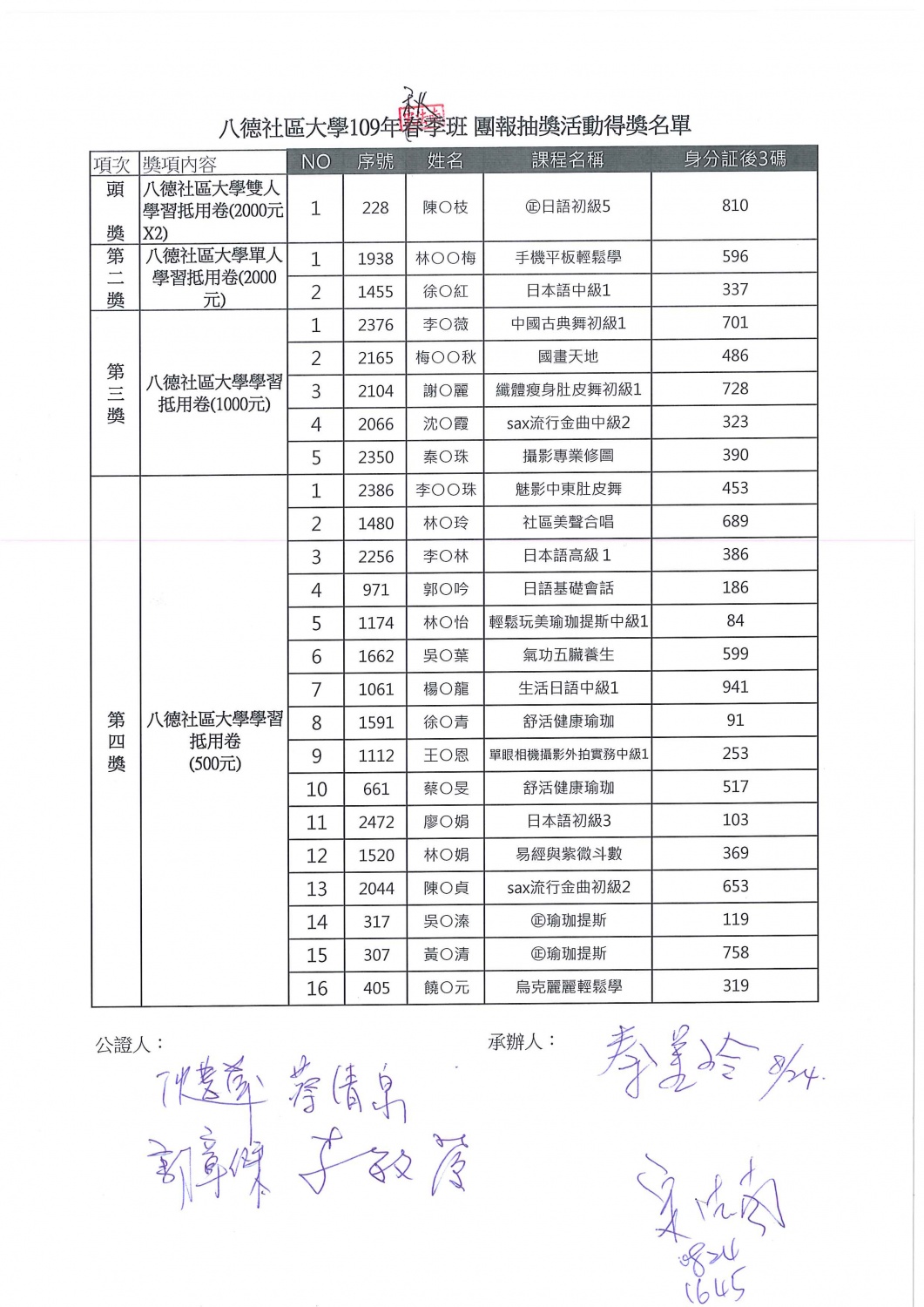 2.領獎辦法:請領獎者或代領者攜帶身份證明相關文件(例:身份證、健保卡…等),至八德社大辦公室領取。