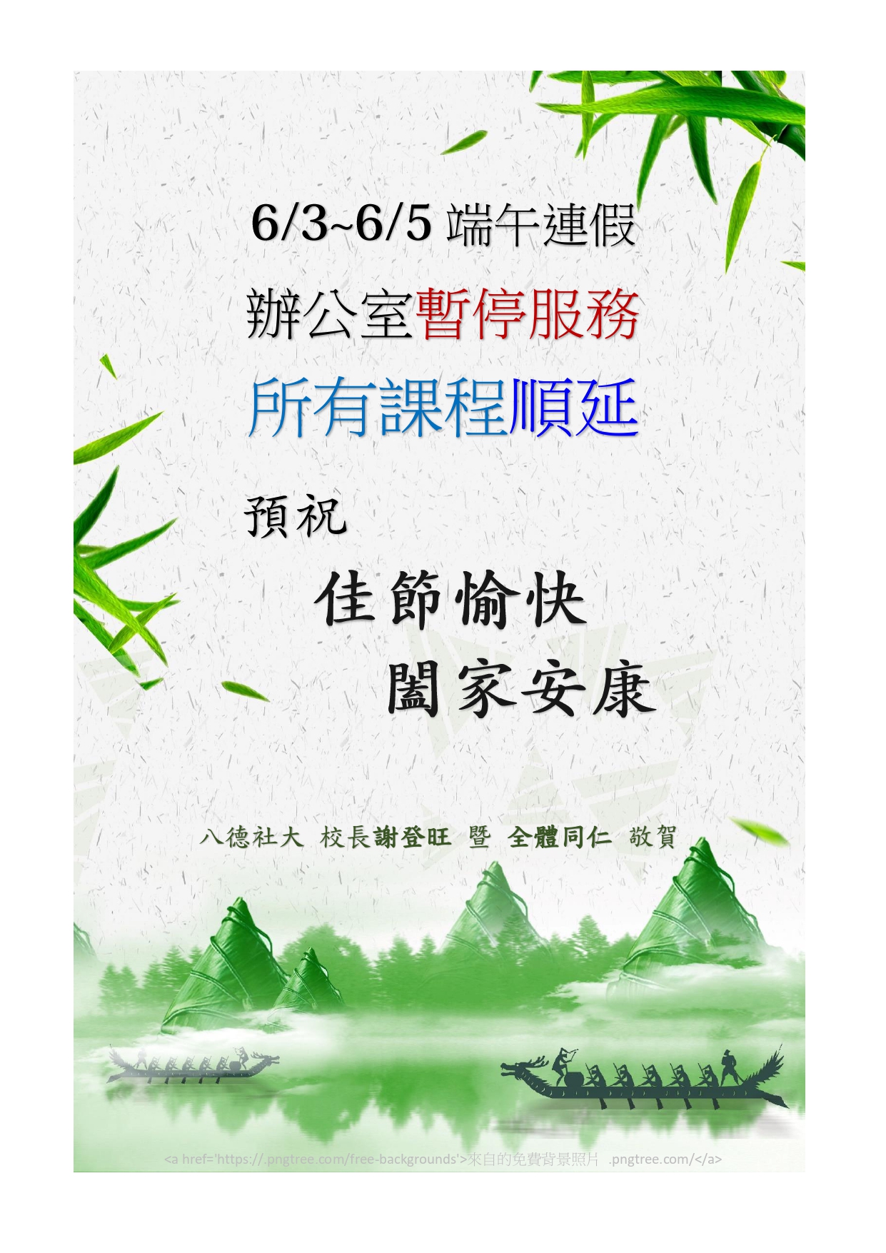 6/3~6/5端午連假 辦公室暫停服務 所有課程順延